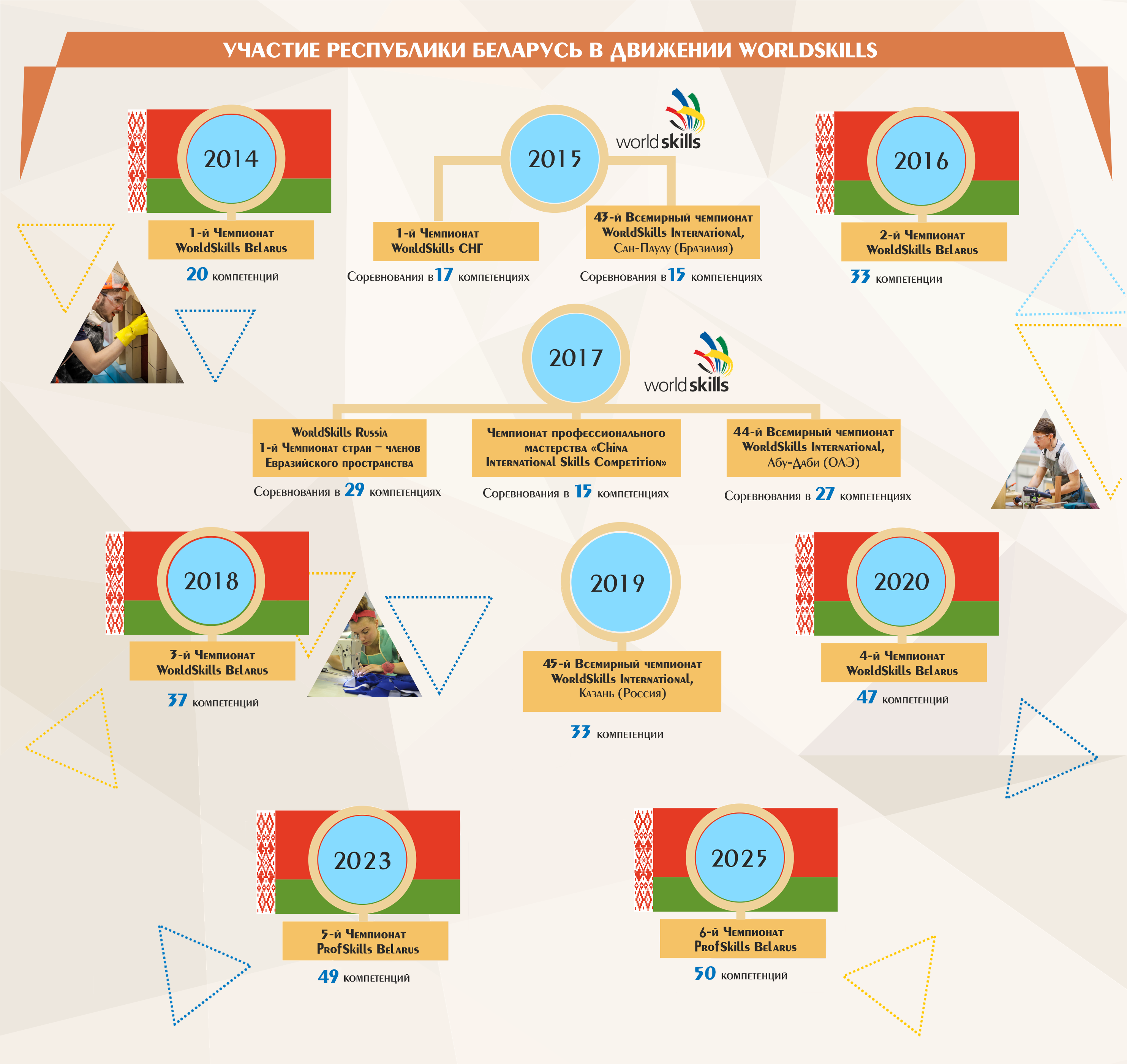 Республика Беларусь присоединилась к движению WorldSkills в январе 2014 г. На Генеральной ассамблее в Люцерне (Швейцария) Республика Беларусь официально стала 68-м членом движения WorldSkills International.